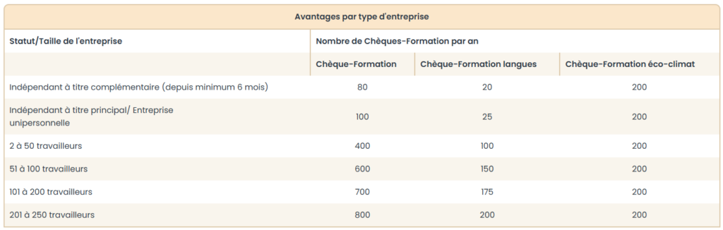 Vous bénéficiez d’un subside de 15 euros par Chèque-Formation. Votre Chèque-Formation ne vous coûte donc que 15 euros. Le nombre de chèques que vous pouvez obtenir par an varie en fonction de la taille de votre entreprise (nombre d’équivalents temps plein selon l’ONSS).